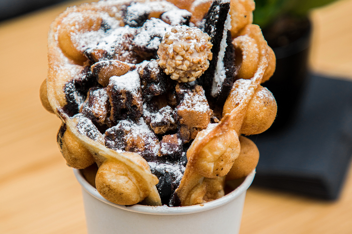 Waffle em formato de bolhas, crocante por fora e macio por dentro, servido enrolado como cone e recheado com sorvete, frutas, doces e coberturas diversas.