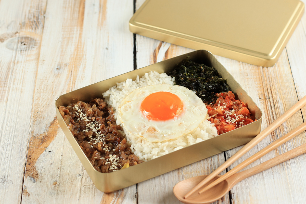 Marmita coreana tradicional, com arroz, kimchi, vegetais e proteína (como carne, ovo ou peixe), organizada em compartimentos e servida como refeição completa.