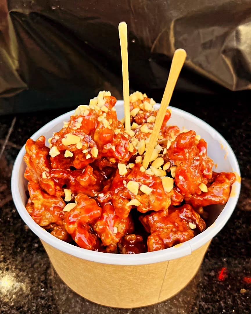 Versão coreana do frango frito, com uma casquinha super crocante e cobertura de molhos variados, desde o agridoce ao picante.