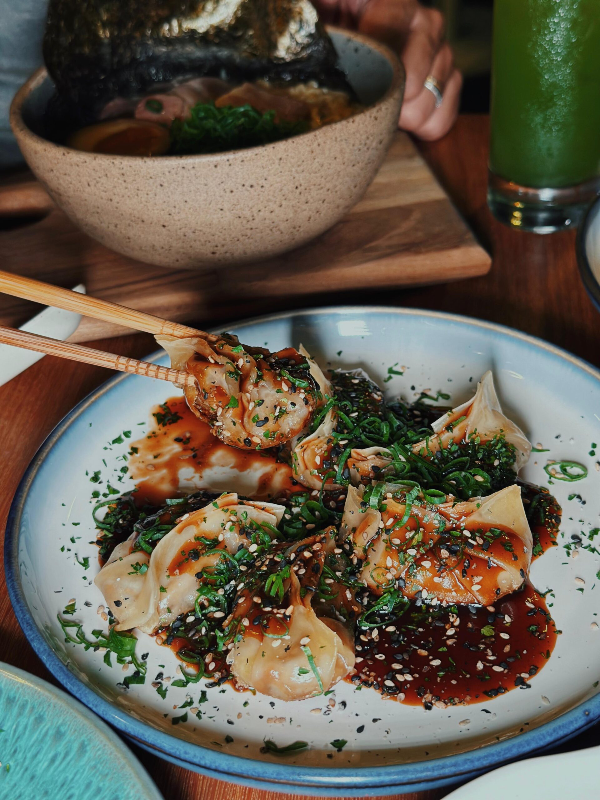 Pastelzinho japonês de massa fina, recheado geralmente com carne suína, legumes e temperos, servido frito, grelhado ou cozido no vapor.