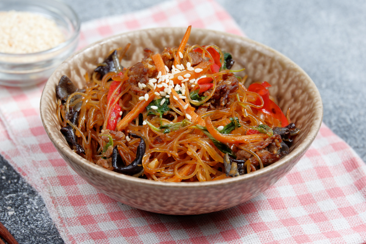 Macarrão coreano feito com dangmyeon (macarrão de batata-doce), salteado com legumes, carne bovina e temperos como molho de soja e óleo de gergelim.