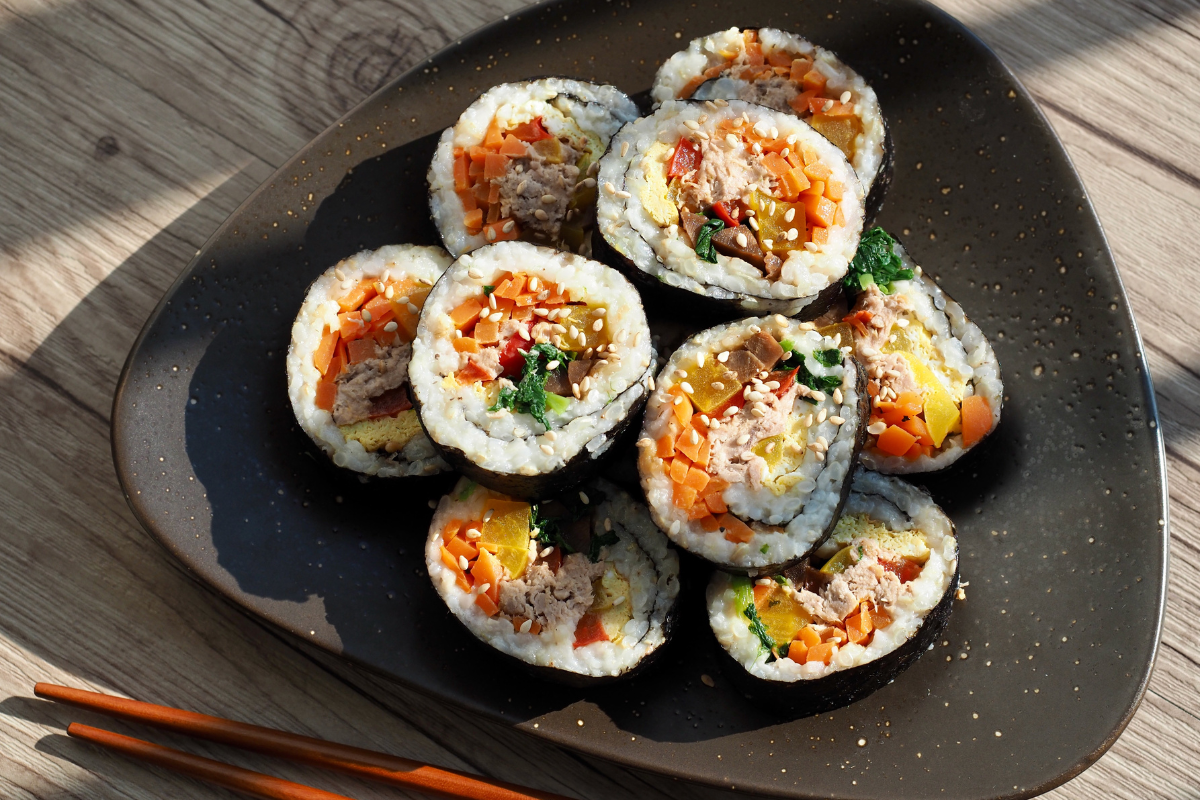 Prato coreano feito com arroz temperado e recheios variados (como legumes, carne ou omelete), enrolados em alga marinha. Lembra um sushi, mas é servido frio e sem peixe cru.