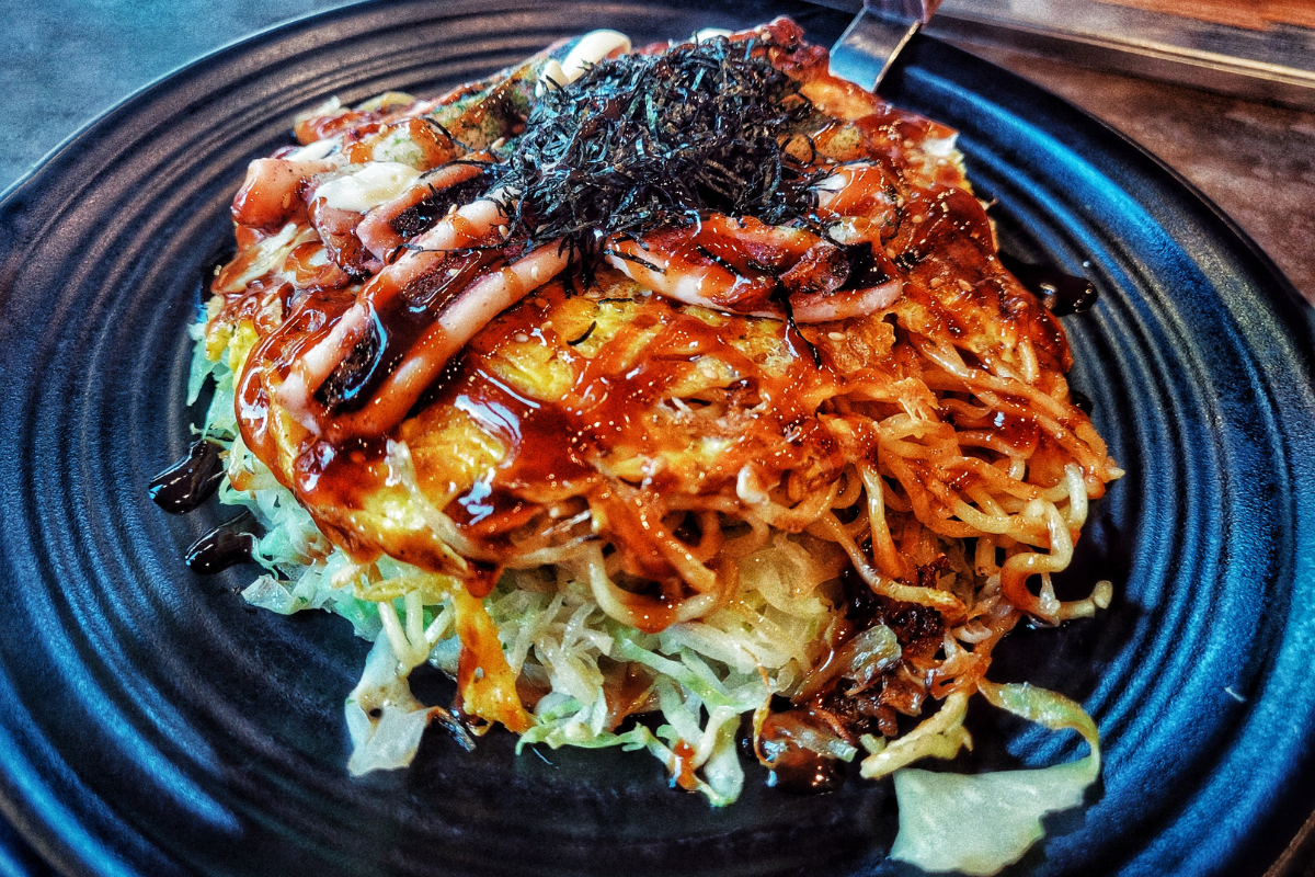 Panqueca japonesa feita com repolho, massa e outros ingredientes como carne de porco, frutos do mar ou queijo, grelhada na chapa e coberta com molho agridoce, maionese japonesa e alga seca.