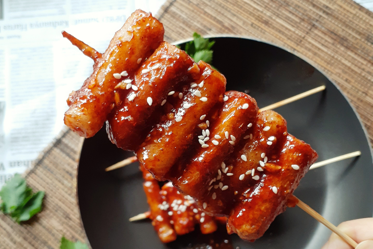 Espetinho coreano com bolinhos de arroz (tteok) intercalados com salsichas (so), grelhado e coberto com molho agridoce ou picante.