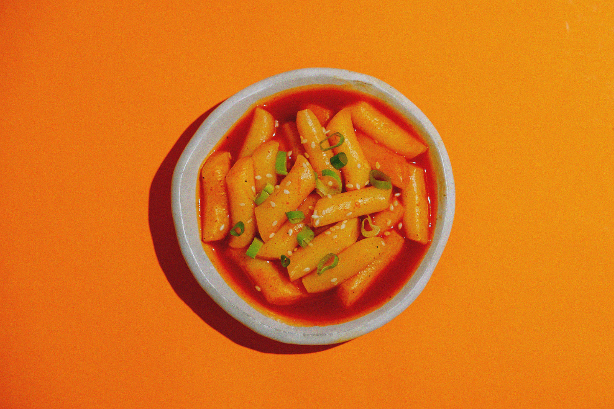 Bolinho coreano de arroz cozido (tteok) servido com molho picante adocicado feito com gochujang (pasta de pimenta fermentada). Pode vir com ovos, fish cakes e cebolinha.