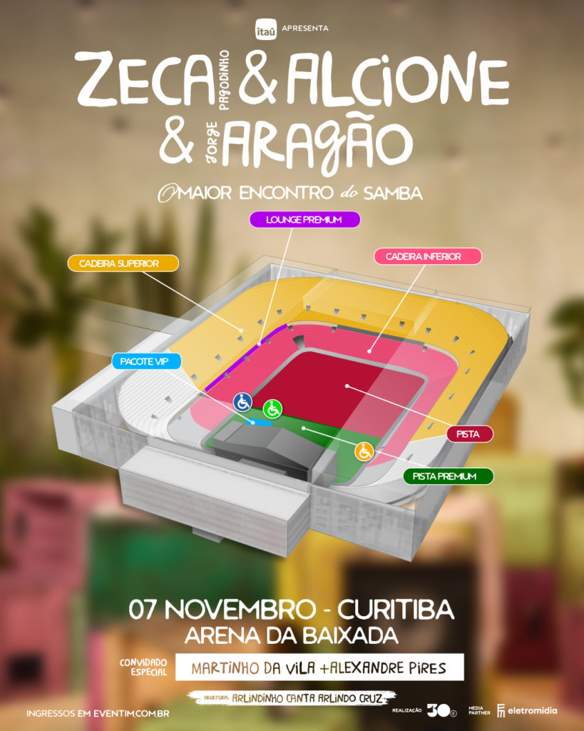 Para o show de Curitiba estão confirmadas as apresentações de Martinho da Vila e Alexandre Pires. Já os ingressos disponíveis são Cadeira Superior, Pista e Cadeira Inferior, além de categorias como Camarote, Lounge Premium e Pista Premium, cujos valores sobem conforme o nível de experiência desejado no evento.